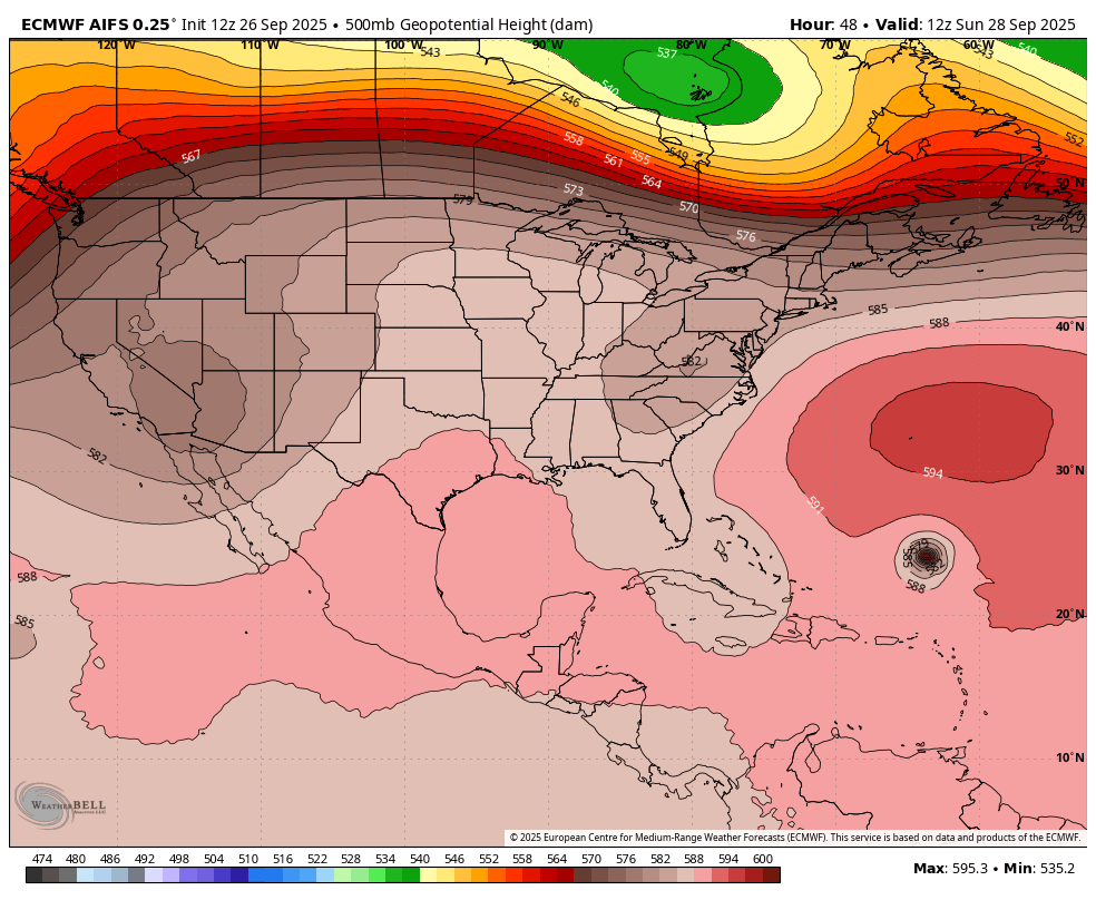 Figure 3: 12z Euro AI model 500 mb steering pattern showing Humberto producing a weakness in the ridging, allowing Imelda to make a northeastward turn before reaching the Southeast coast of the US.